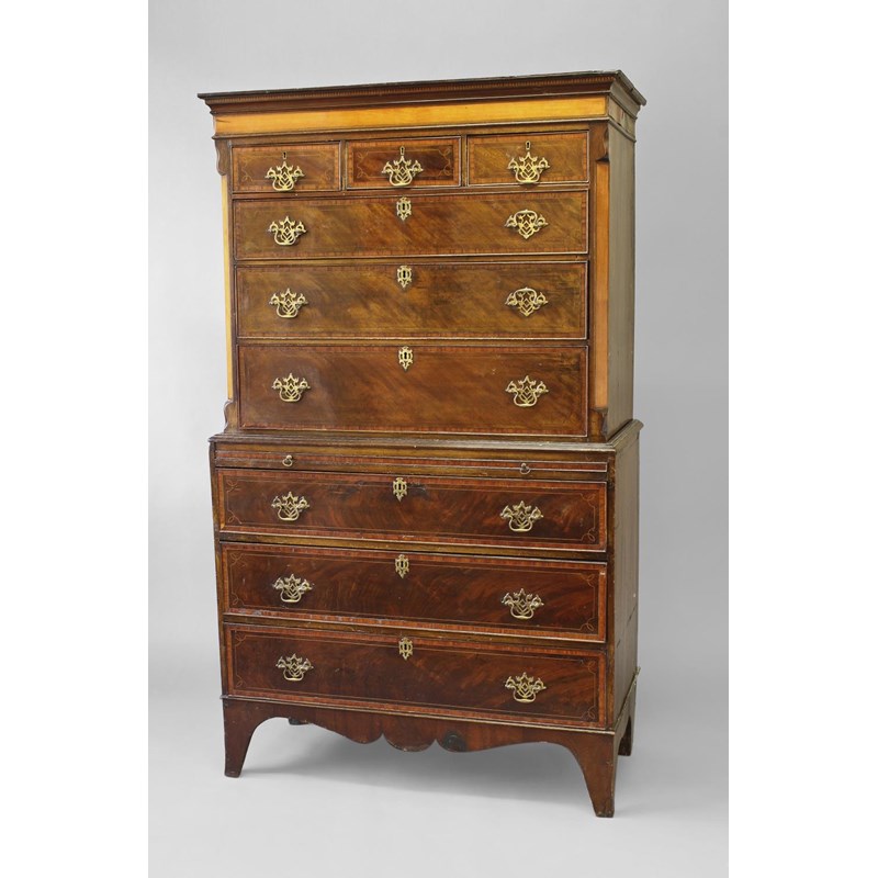 the upper section with a moulded cornice above a satinwood frieze with chequered stringing above three short and three long crossbanded drawers, the lower section with a brushing slide above three further long drawers, on tall bracket feet with a wavy edged frieze, 18th century and later, height 176cm, width 104cm