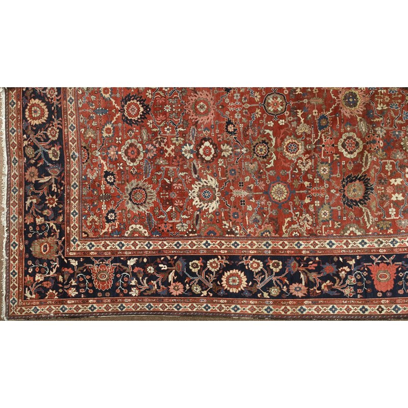 c.1890, the tomato red field with an all over design of large flowerheads and angular vines enclosed by indigo borders of meandering vines flanked by triple guard stripes approx 730cm x 410cm