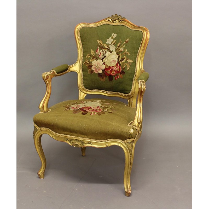 A 19TH CENTURY FRENCH GILT FRAMED OPEN ARMCHAIR, with floral tapestry seat and back on scrolling supports, height 91cm