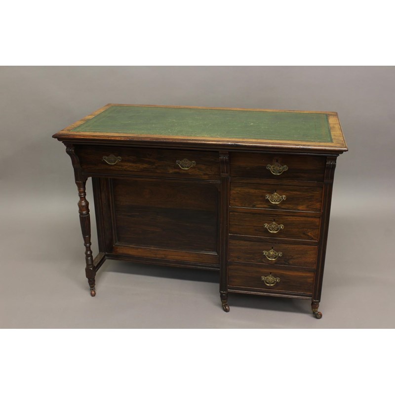 AN EDWARDIAN ROSEWOOD WRITING DESK, the leather-inset top above an arrangement of six drawers and a cupboard to the left side, on turned reeded support and castors, height 76cm, width 106cm, depth 55cm