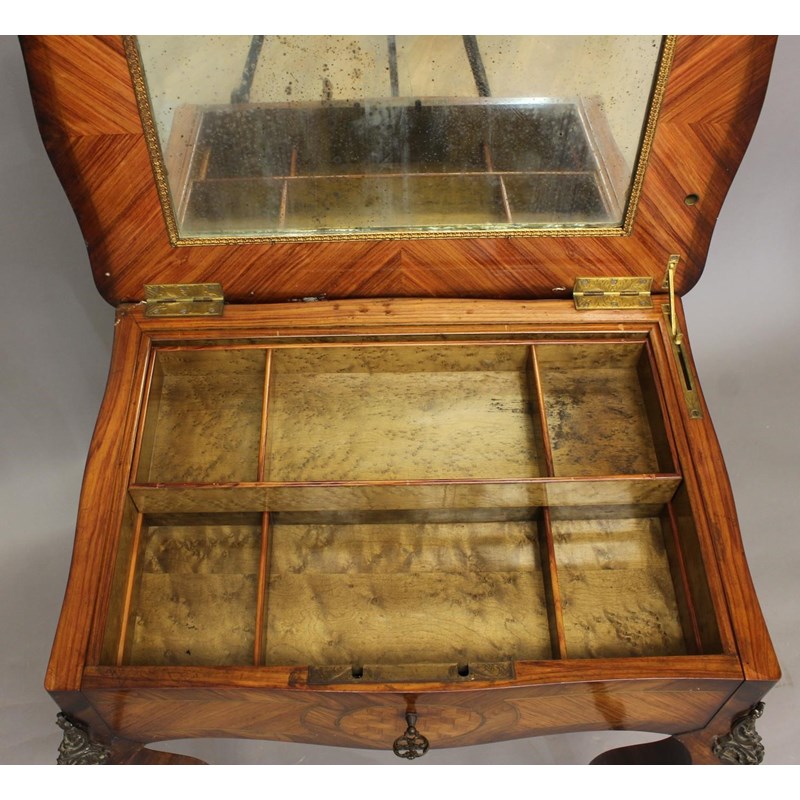 the shaped rectangular top inlaid with birds and foliage, with brass border, lifting to reveal a maple-lined compartmentalised interior with mirror, the sides and front with parquetry inlay above a slide-out work box on brass-mounted cabriole legs, height 76cm, width 64cm, depth 45cm