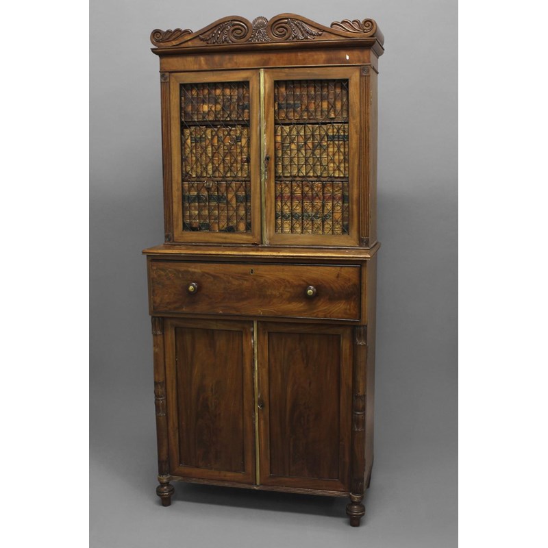 The upper section with a scrolling and leaf carved cornice above twin doors with faux-book fronts behind wire grills, the shelved interior with later filing trays. The lower section with a secretaire drawer with brass fronted knob handles and ebonised cock beading, the drawer fitted with a selection of short drawers and pigeon holes,above twin panelled cupboard doors between leaf carved pillars, on short turned legs with ebonised turned decoration. height 177cm, width 80cm, depth 40cm
