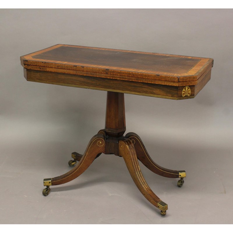 A REGENCY ROSEWOOD CARD TABLE, with satinwood and brass inlay on a scrolling quadripartite base, height 75cm, width 91cm