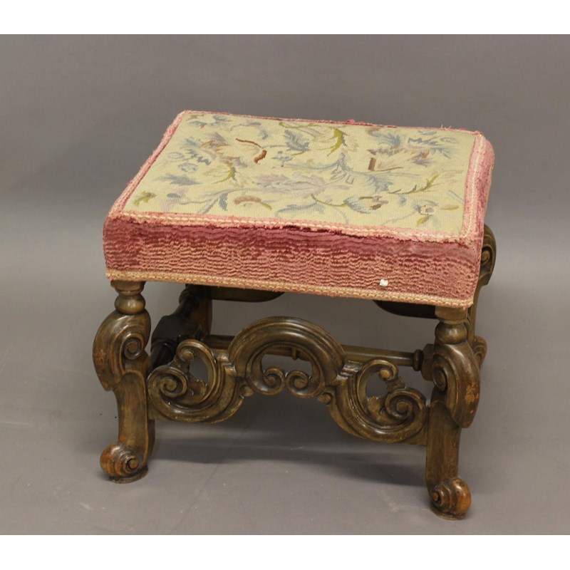 A WILLIAM AND MARY STYLE WALNUT STOOL, with needlework seat on a scrolling frame with turned stretcher, height 45cm, width 57cm