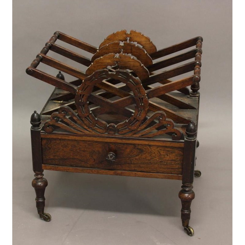A REGENCY ROSEWOOD CANTERBURY, with three 'X' form sections fronted by laurel wreath decoration, above a single drawer on turned supports with acorn finials, height 54cm, width 51cm, depth 40cm