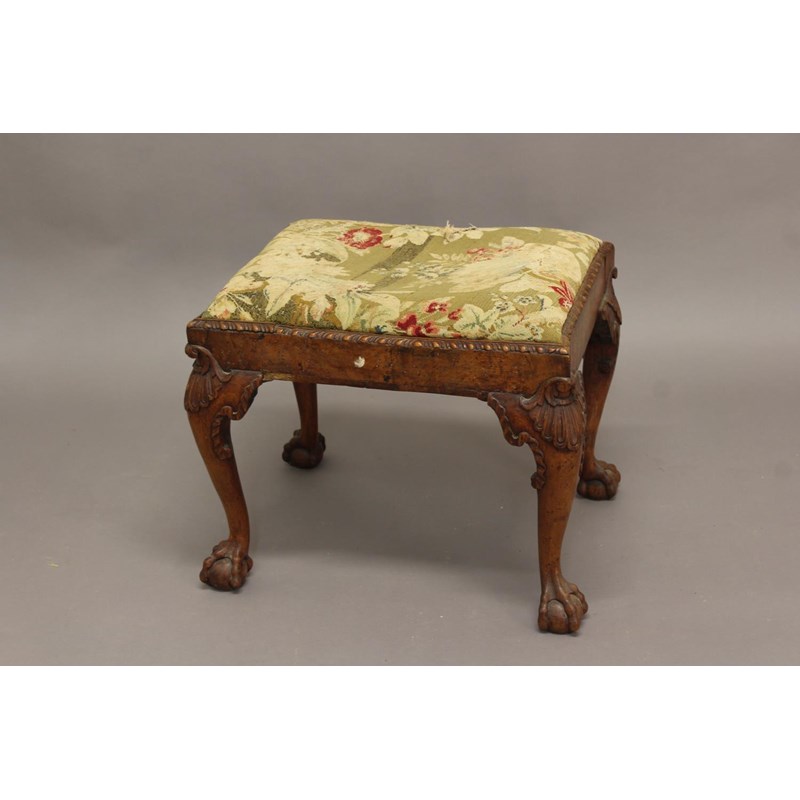 AN 18TH CENTURY WALNUT STOOL, on cabriole legs with shell carved knees and ball and claw feet, height 47cm, width 59cm, depth 47cm