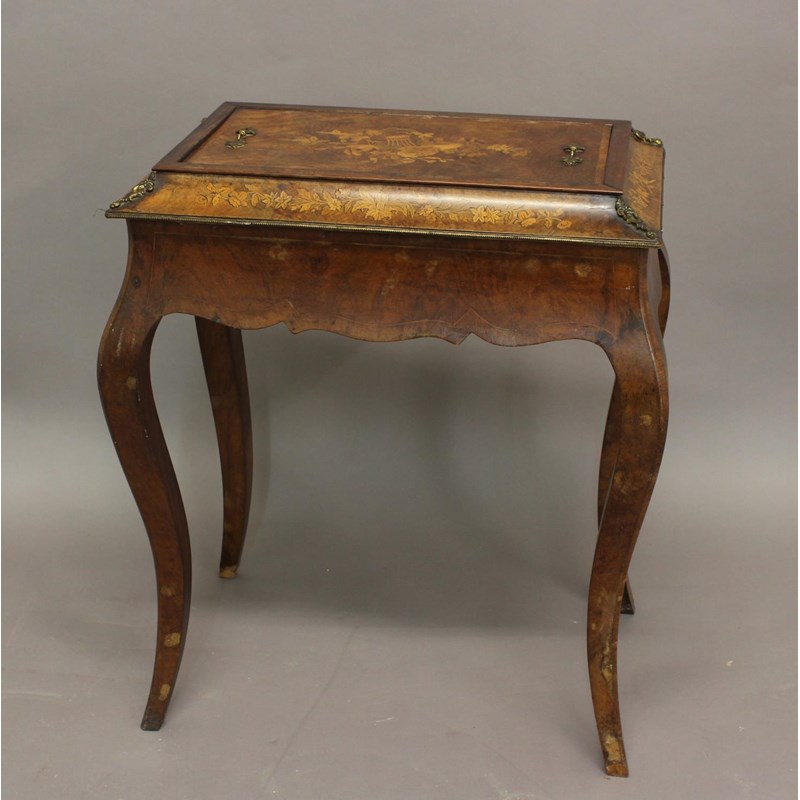 the inlaid top enclosing a lined compartment for plants, with brass handles and mounts, on cabriole legs, height 75cm, width 65cm, depth 42cm