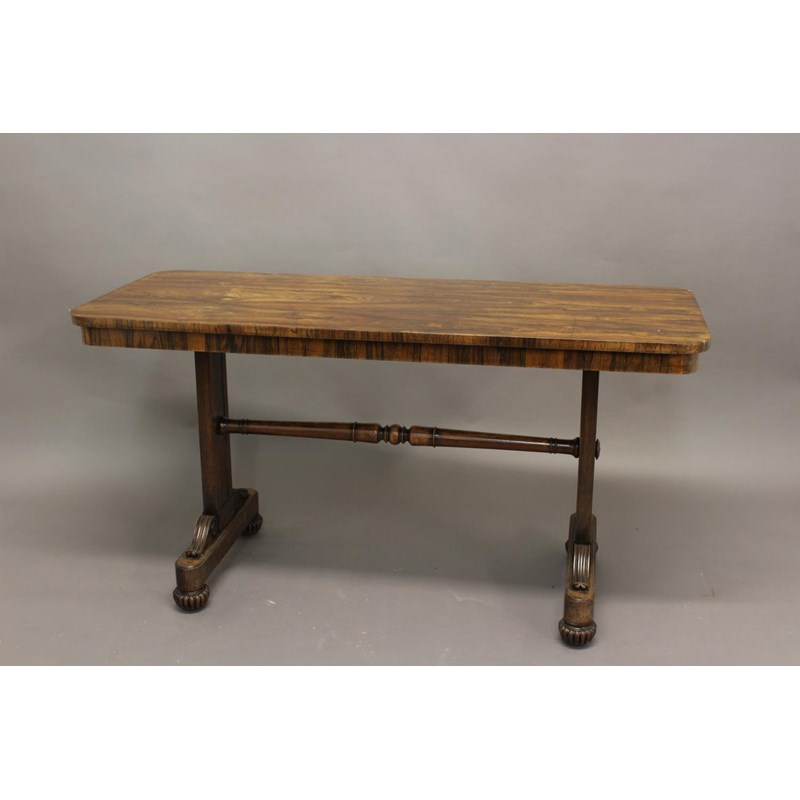 A REGENCY ROSEWOOD CENTRE TABLE, the rounded rectangular top above scrolling supports and turned stretcher on reeded bun feet, height 73cm, width 138cm, depth 55cm