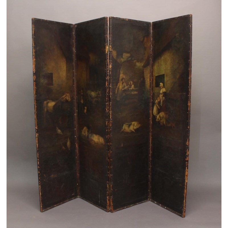 A FOUR FOLD LEATHER SCREEN, 19th century, depicting farmyard scenes with figures and animals, height 177cm, length 185cm