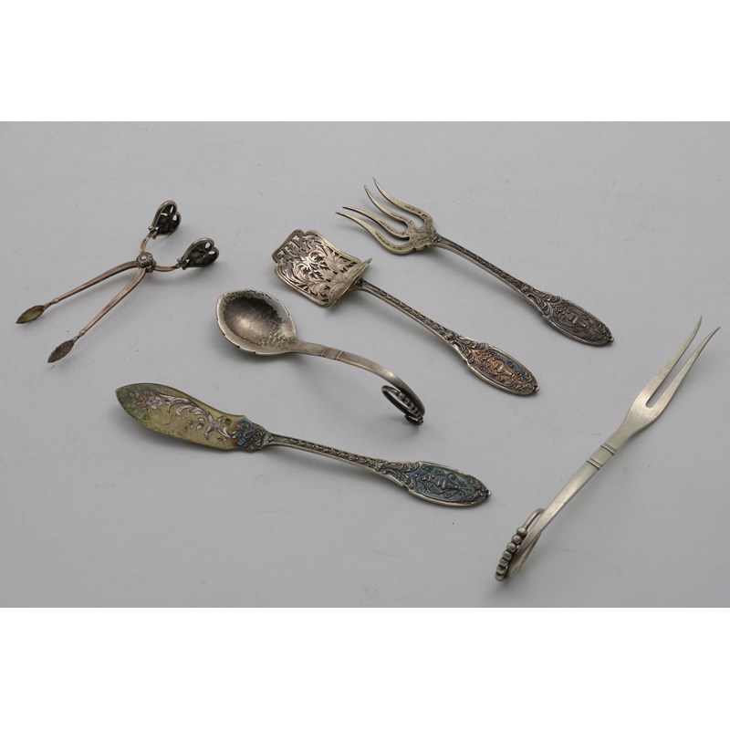 A Danish Blossom pattern spoon with a leaf-shaped bowl and a two-prong fork, by Georg Jensen of Copenhagen (pattern no. 41), a French decorative small serving knife, fork & slice and a pair of Finnish sugar nips with pinecone decoration, maker's mark unclear, probably made in Savanlina, 1952; the nips 4" (10 cms) long; 5.45 oz (6)