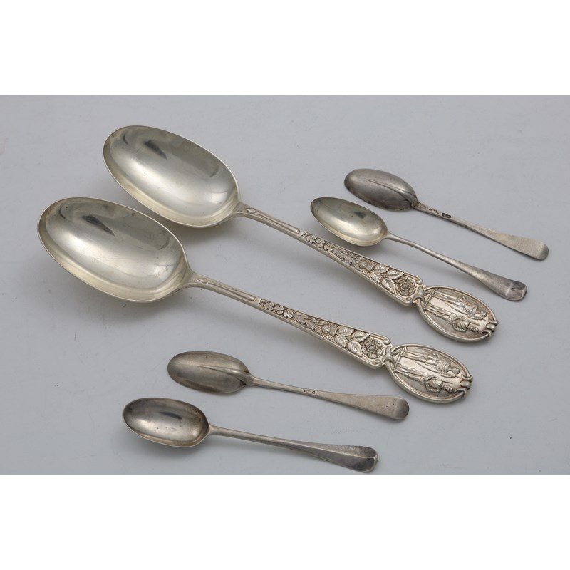 with plain rattails (one Britannia standard), most with either a crest or initials, and a pair of National Rifle Association table spoons, by Elkington & Co., Birmingham 1909; 8.45 oz (6)