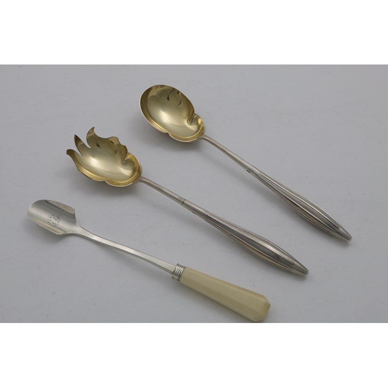 with ribbed, swollen handles & gilt bowls, by Mappin & Webb, Sheffield 1900, together with a George III Stilton scoop with an ivory handle and a scallop shell on the back of the scoop, initialled; the latter 9.3" (23.5 cms) long; 6 oz weighable silver (3)