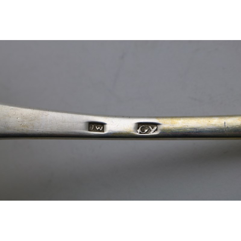 with a plain circular bowl, struck only with two marks; "GY" and "JW", probably Colonial, last quarter of the 18th century; 12.9" (32.7 cms) long; 6 oz