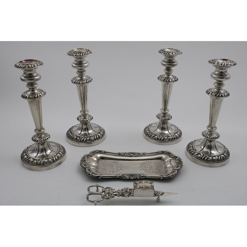with borders of vines and gadrooning, together with an Old Sheffield plated snuffer tray and a pair of close-plated snuffers; the candlesticks 10.2" (25.8 cms) high (6)