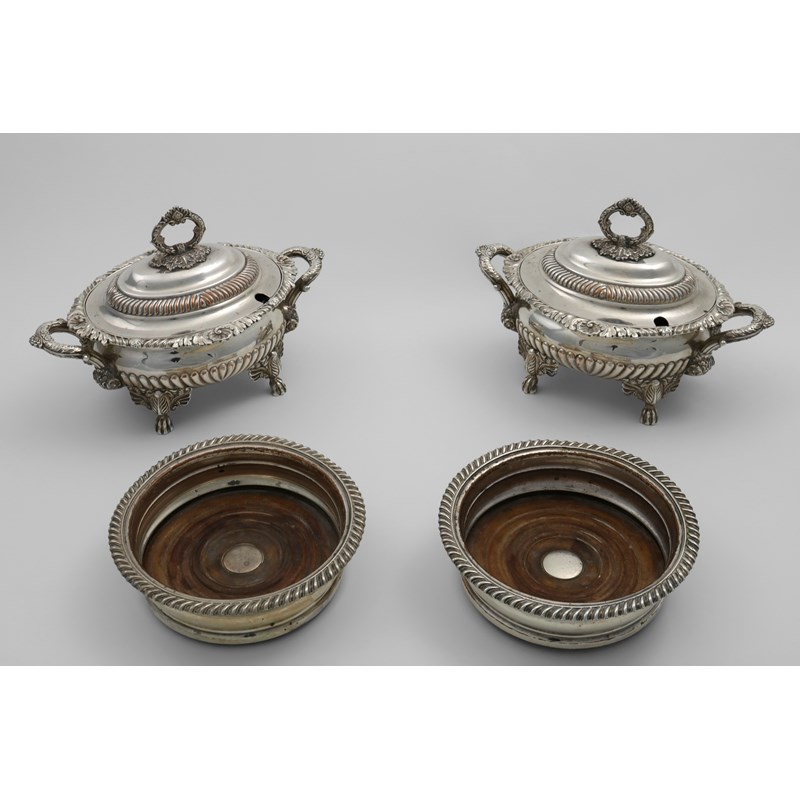 part fluted with ornate paw feet, gadroon and foliate shell borders and drop-in liners, 1815-1820 and a pair of Old Sheffield plated wine coasters with gadrooned borders, turned wooden bases and inset bosses; the tureens 9" (23 cms) long (4)