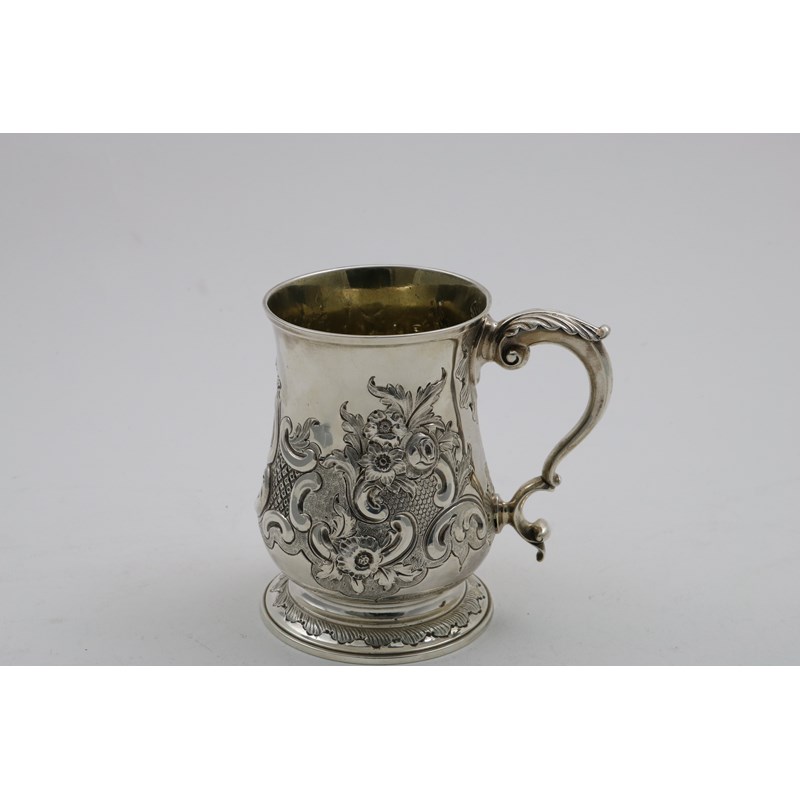 on a spreading foot, embossed decoration, and a leaf-capped scroll handle, vacant cartouche and the scratched initials "N" over "RA" underneath, gilt interior, by Charles Wright, London 1768; 5.25" (13.3 cms) high; 13.8 oz