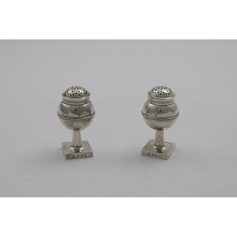on square pedestal bases, with spherical bodies, engraved on the front with a lozenge coat of arms, maker's mark "JR", Edinburgh 1929; 3.35" (8.4 cms) high; 3.65 oz (2)