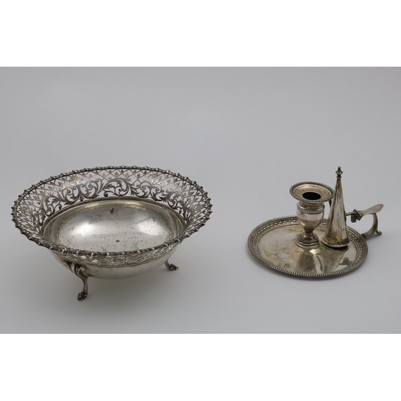 with borders of beading and repeating bell flowers, detachable nozzle and conical snuffer, crested, by James Dixon & Sons, Sheffield 1896 and a circular dish on three legs with a gadrooned rim and a fret-pierced border, by the same maker, Sheffield 1913; the latter 8" (20 cms) diameter; 19.45 oz (2)