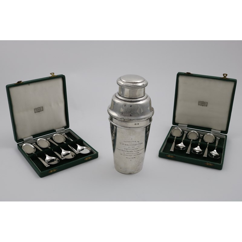 with a presentation inscription on one side, by Suckling Ltd., Birmingham 1935 and two cased sets of six ice-cream spoons by Charles Boyton & Sons, Sheffield, mixed dates 1938-58 (retailed by Harrods); the shaker 9" (23 cms) high; 24.3 oz weighable silver (3)