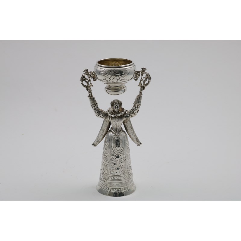 in the form of a lady in a crinoline dress with double sleeves holding a vessel above her head, gilt bowl interiors, with pseudo marks & English import marks for B. Muller, Chester 1905; 8.5" (21.7 cms) high; 8.75 oz