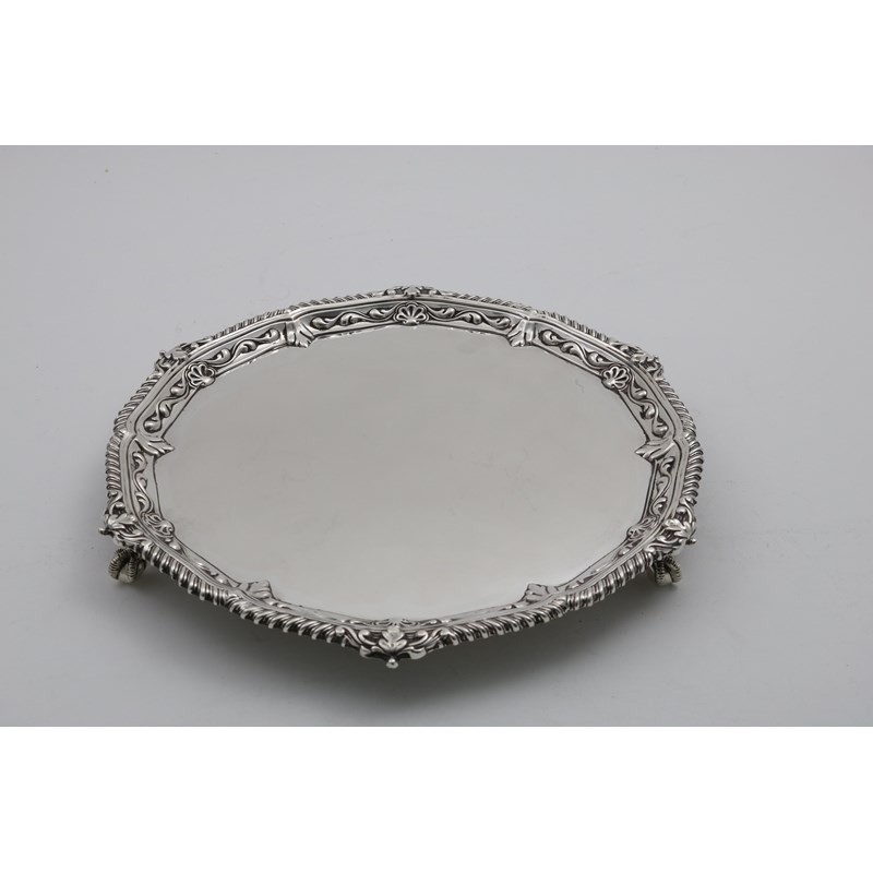 A LATE VICTORIAN SALVER of shaped circular outline with a decorative border of gadrooning, shells and scrolls, and ball & claw feet, by Ward G Sissons, London 1891; 10.5" (26.8 cms) diameter; 19.2 oz