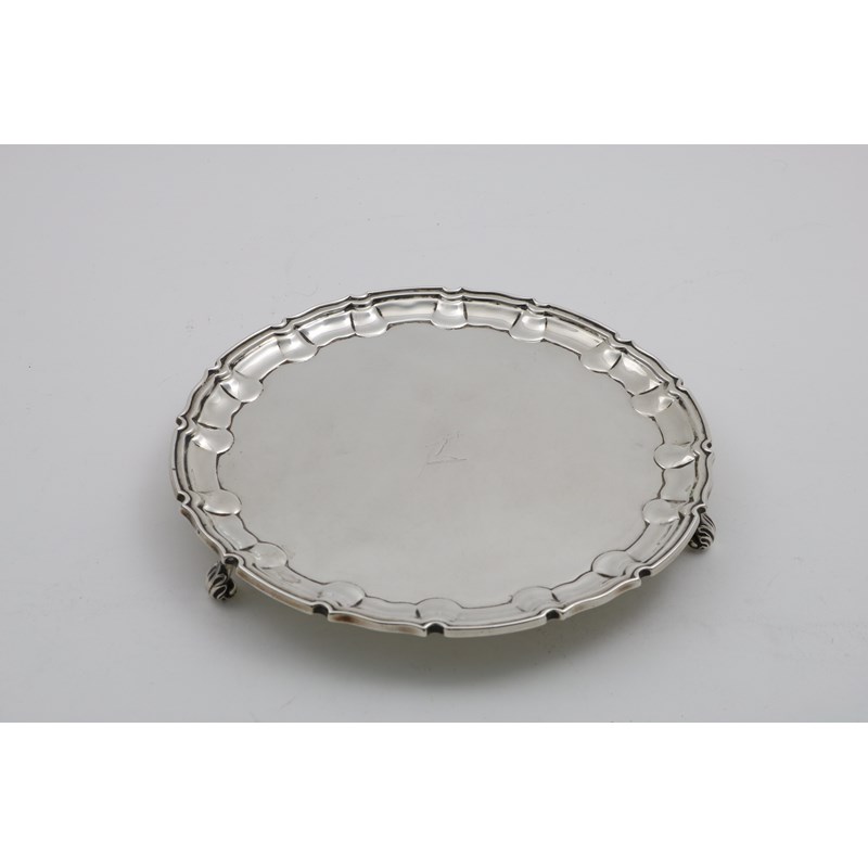 AN EDWARDIAN SALVER of shaped circular outline with a moulded border and scroll feet, crested, by William Hutton & Sons Ltd., London 1902; 8.5" (21.5 cms) diameter; 14.75 oz