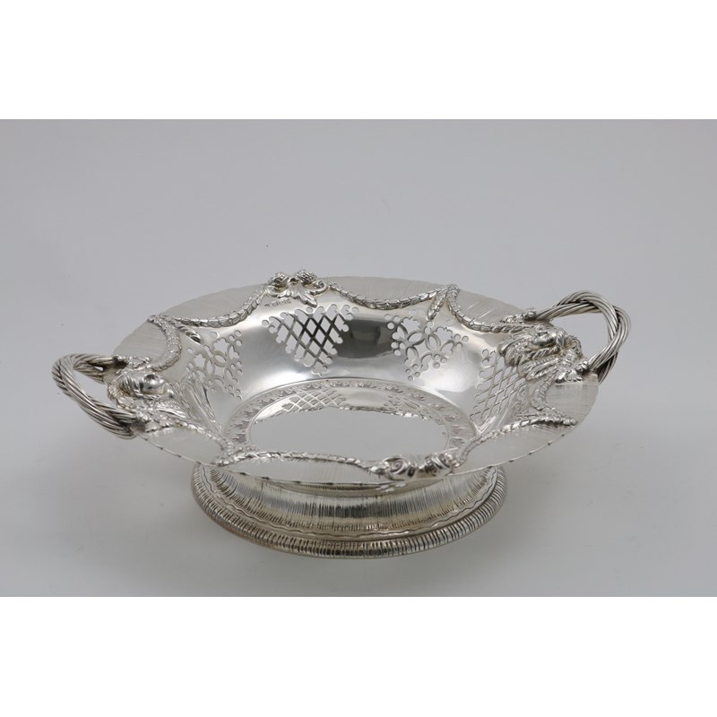 with pierced sides and twin, corded wire handles, the everting rim chased with matting and decorated with applied female masks and garlands of bell flowers on a ribbed foot, by T. Bradbury & Sons, Sheffield 1901; 10.6" (27 cms) long overall; 21.85 oz