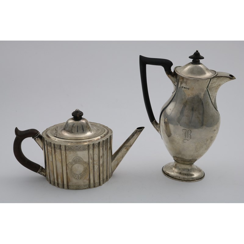 oval, with fluting and bright-cut borders, cartocuhes and a domed cover, initialled, by George Eadon & Co., Sheffield 1793 and an early 20th century hot water jug, on an oval pedestal foot, initialled "B" on one side, maker's mark "WL&S", Sheffield 1910; the latter 10.55" (27 cms) high; 34.3 oz (2)