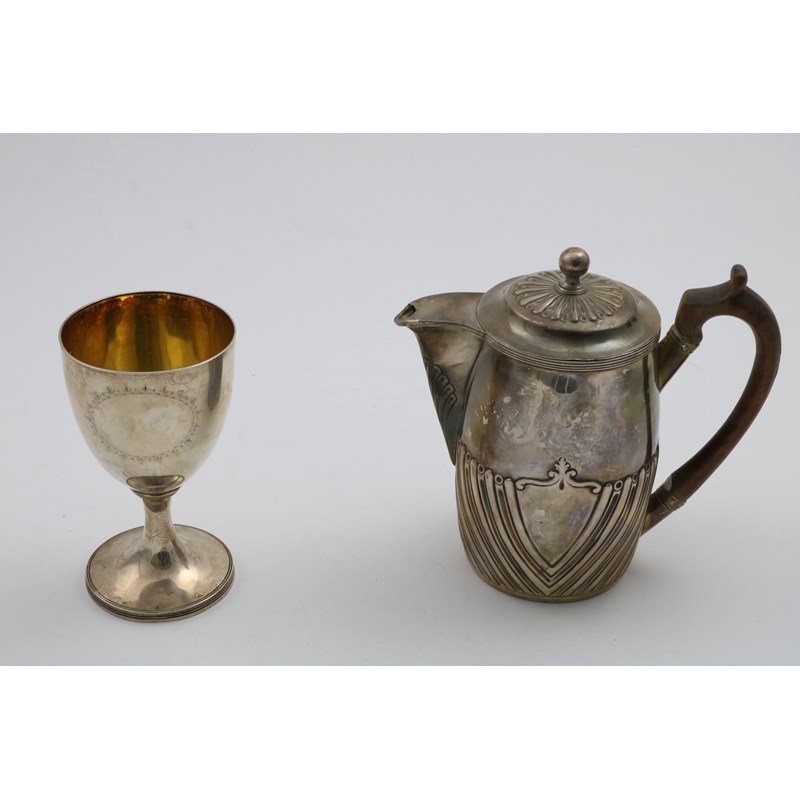 with part-fluting and a lift-off cover with a ball finial, by Peter and William Bateman, London 1808, and a George III goblet with a reeded foot, a bright-engraved oval cartouche and a gilt interior, also by Peter & William Bateman, London 1808; the latter 5.7" (14.5 cms) high; 22 oz (2)