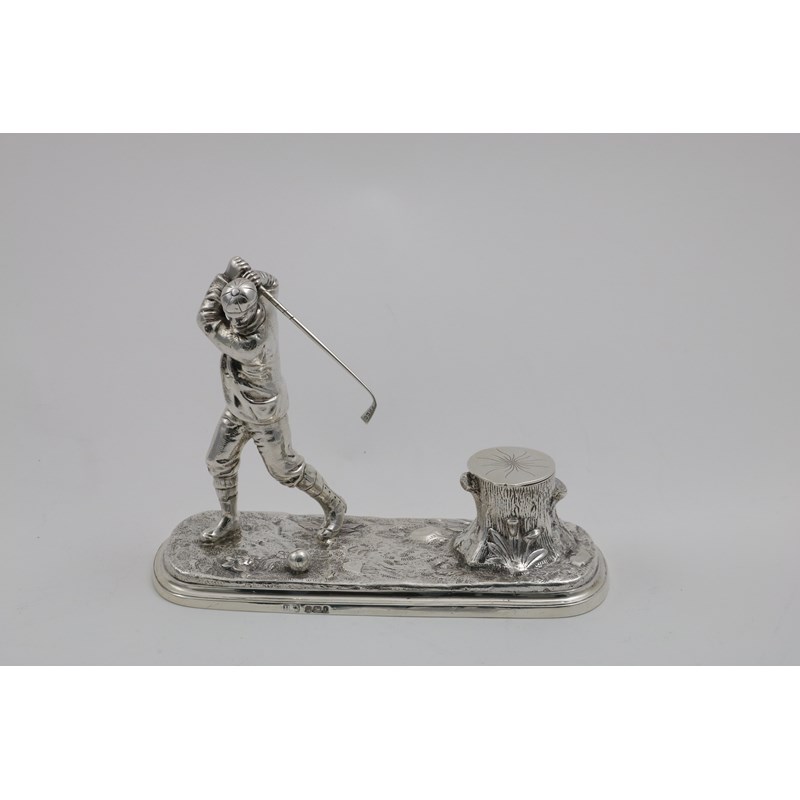 A late Victorian cast inkstand in the form of a golfer on a rounded oblong base, about to take a swing at his ball in the rough, with tree-stump at his side, lift-up cover and glass liner, the club initialled "F.H.G.C", by H. Williamson, Sheffield 1895; 8" (20.5 cms) long; 23.45 oz weighable silver
