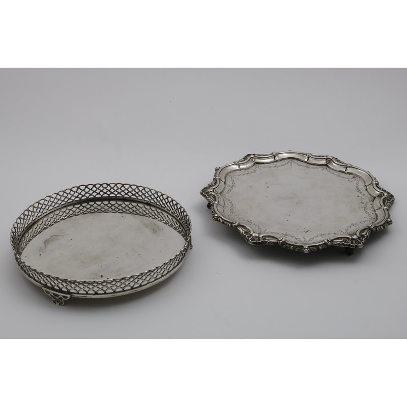 of shaped circular outline on ball & claw feet, with an embossed border and flat-chased garlands of flowers, by Manuel Martins Alves Fendas, Oporto, last quarter of the 18th century (1775-85) together with a late 19th/early 20th century Portuguese salver with a pierced gallery and feet, Oporto 1886-1938; the latter 8.7" (22 cms) diameter; 32.7 oz (2)