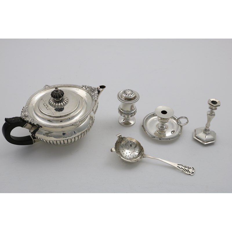 A small Edwardian tea pot with a part-fluted circular body, by Walker & Hall, Sheffield 1907, a tea strainer, two taper sticks (from inkstands) and a George III pepper caster; the latter 3.1" (8 cms) high; 24 oz (5)