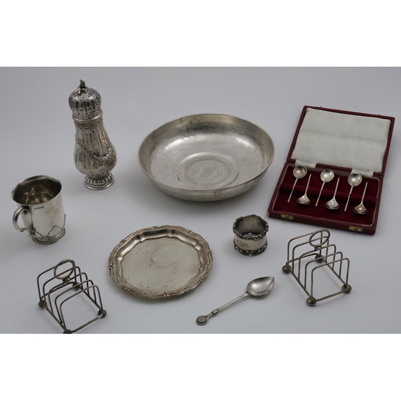 A cased set of six modern "slip top" coffee spoons, an Egyptian bowl, a waiter, a pair of small toast racks, a Continental sugar caster with import marks for London 1904, a mug, inscribed, a napkin ring, initialled, and an unmarked, hand-made spoon with a stone-set terminal;  the latter 5"  (12.7 cms);  39 oz  (9)
