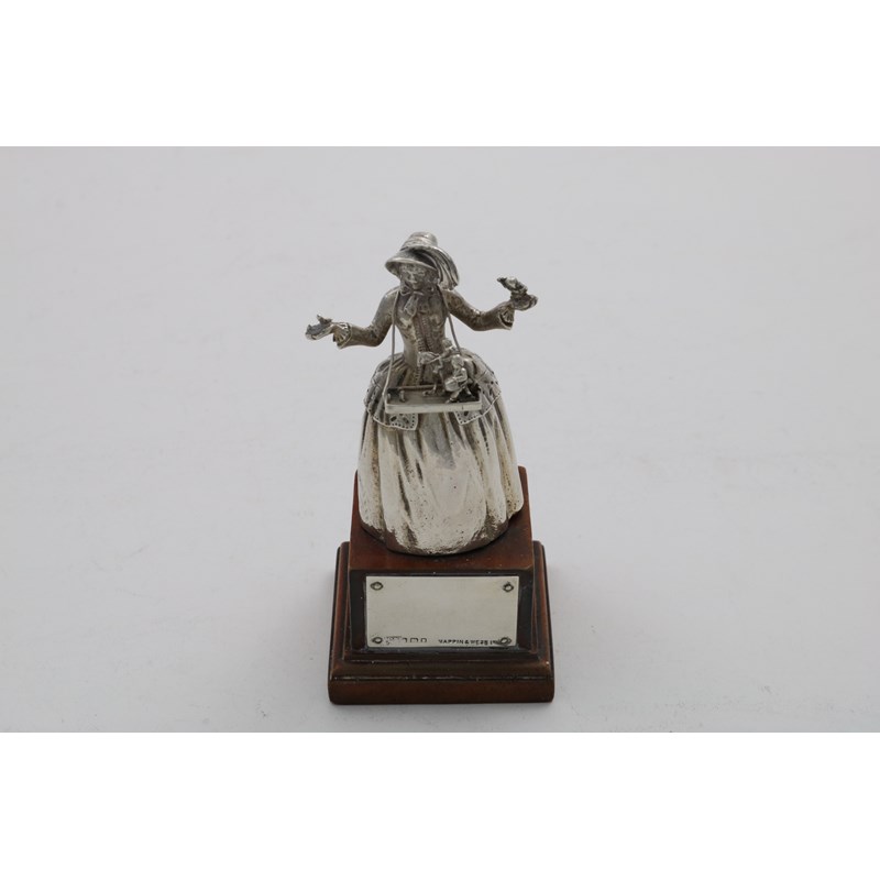 in the form of a young lady in a crinoline dress and bonnet, peddling her wares, on a mounted wooden plinth, by Mappin & Webb, London 1923;  the figure 3.2"  (8 cms) high;  5.25 oz