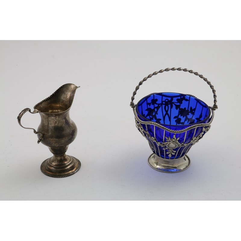 on a domed circular foot, with a scroll handle and a punch-beaded rim, initialled, by Thomas Shepherd, London 1780 and a George III wirework sugar basket with a swing handle, wavy rim and applied bird and floral festoons around the sides, blue glass liner, maker's mark rubbed, London 1770;  the jug 4.75"  (12 cms) high;  7 oz weighable silver  (2)