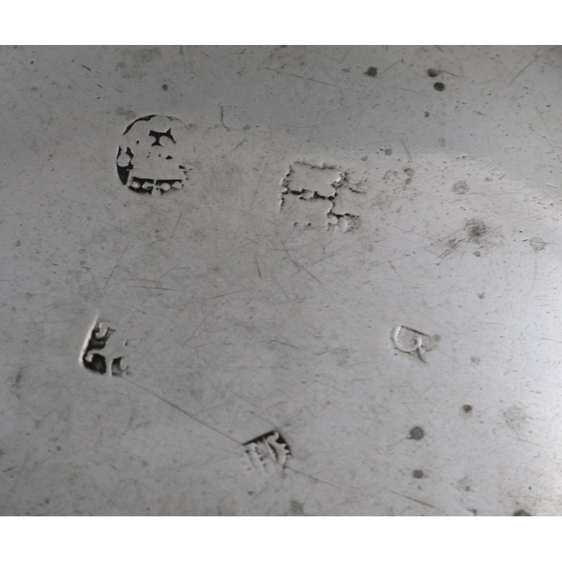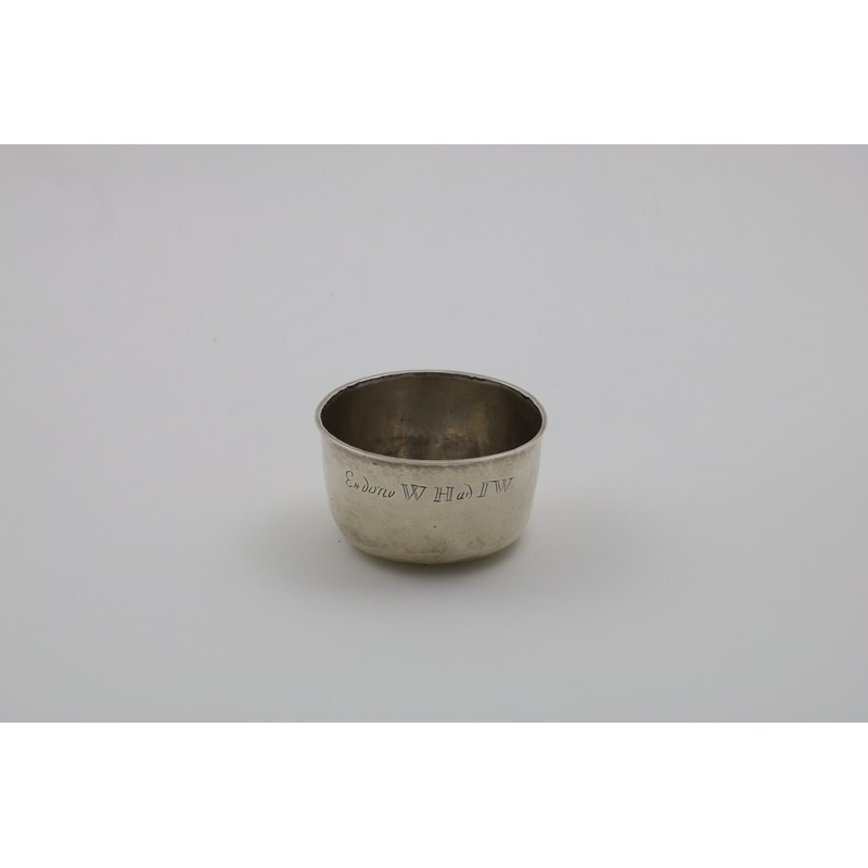 of shallow circular form with a slightly flared rim, scratched on one side with the following "EX DONO W HAD I.W", maker's mark partially worn, probably by Robert Makepeace, Newcastle 1721; 2.95" (7.3 cms) diameter; 1.8 oz