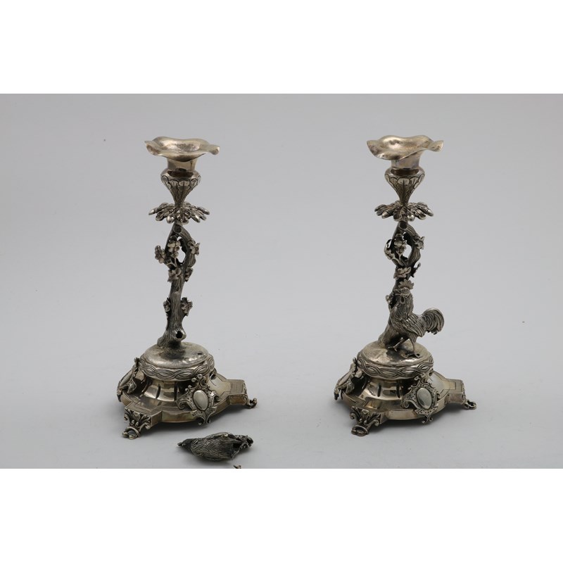 on shaped bases with applied cartouches, the naturalistic columns and drip pans with oak leaves and acorns with an attendant cockerell at the base (one maker's mark "GUILHERME SSD", Oporto 1870-80; 9.9" "25.2 cms) high; 30/5 oz (2)