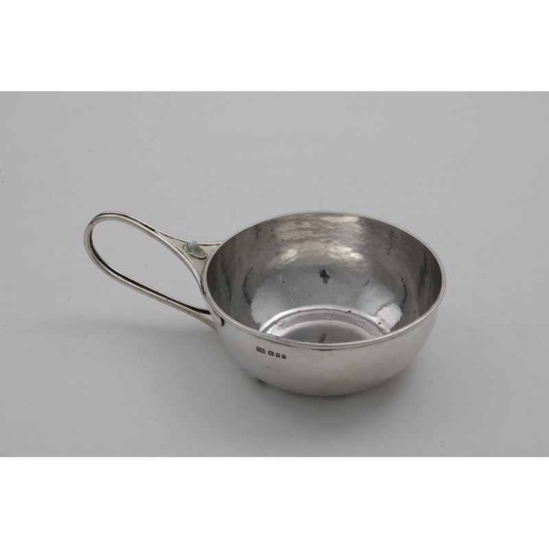 of plain circular form with a bifurcated, looping handle, set with a natural pearl boss, by the Guild of Handicraft (of Chipping Campden), London 1925, with retailer's stamp of "Hart & Huyshe Campden, Glos"; 7" (17.8 cms) long; 5.4 oz