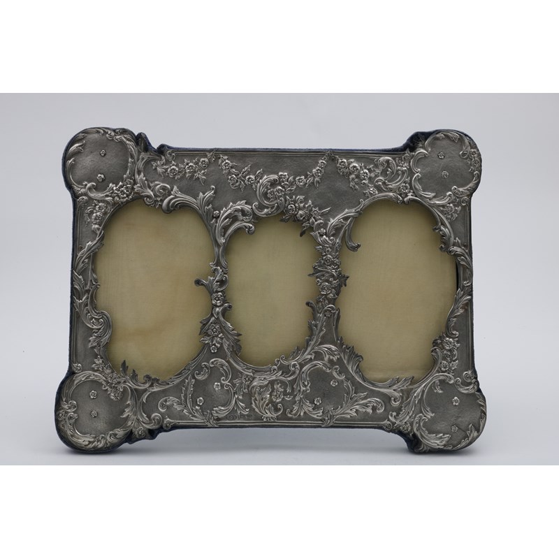 of shaped rectangular outline with three "windows" (to take three photographs), the mount textured and chased with flowers and leafy scrolls, easel back, by Elkington & Co., London 1899; 17" (43.4 cms) long; 13" (33 cms) long