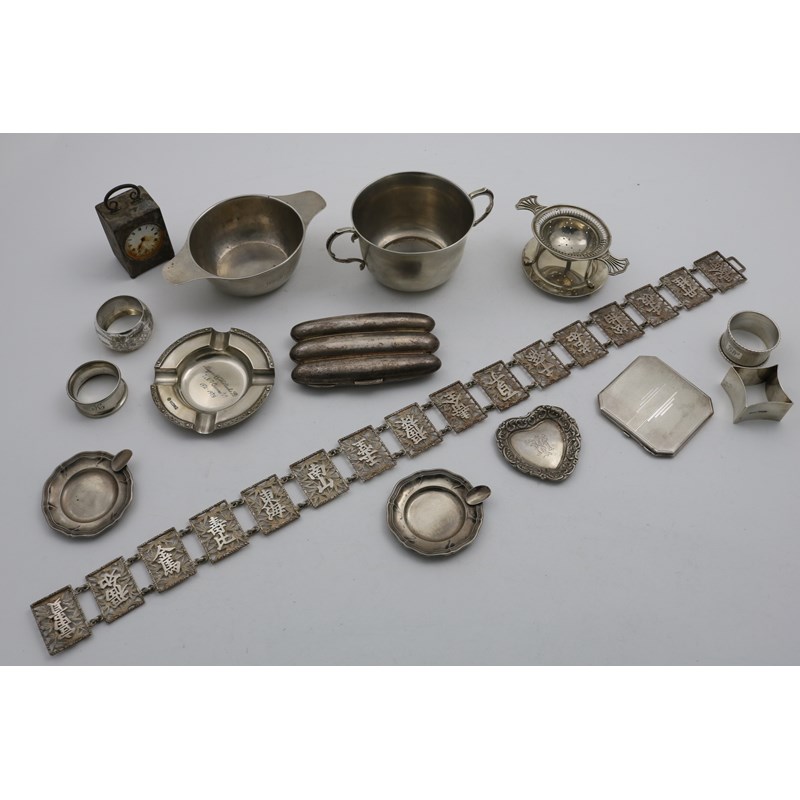 A Chinese linked belt, decorated with pierced bamboo foliage and applied Chinese characters, a Continental carriage timepiece with English import marks for 1910 (A/F), a powder compact, a late Victorian three-division cigar case, a tea strainer & stand, four napkin rings (two initialled), three small ash trays, a pin dish, a porringer and a two-handled christening bowl, inscribed "HILARY" by Liberty & Co., Birmingham 1919; the latter 6.5" (16.5 cms) long; 29.5 oz weighable silver (lot)