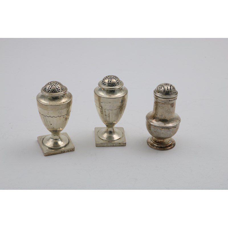 on square pedestal bases with shallow fluting and bun covers, initialled "D", by either John Lias or John Lambe, London 1808 and a single George II vase-shaped pepper castor with a bun cover, by Samuel Wood, London 1734; the latter 3.7" (9.3 cms) high; 7 oz (3)