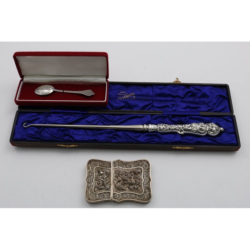 a late Victorian mounted steel boot hook with an embossed handle, by William Comyns, London 1891 (in original case) and a cased modern reproduction of a "Charles II laceback trefid spoon"; the latter 4.1" (10.5 cms) long; 2.2 oz weighable silver (3)