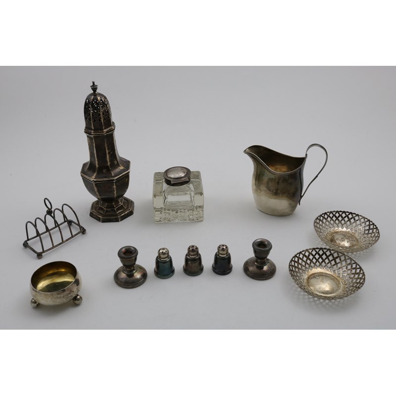 A pair of bonbon dishes by A & J. Zimmerman, Birmingham 1919, a sugar caster by Walker & Hall, Sheffield 1923, a Victorian salt, gilt interior, a small toast rack, a George III cream jug, initialled, London 1800, a pair of dwarf candlesticks, a set of three miniature condiments, and a late Victorian mounted glass inkwell; the caster 8.4" (21.4 cms) high; 16.8 oz weighable silver (12)