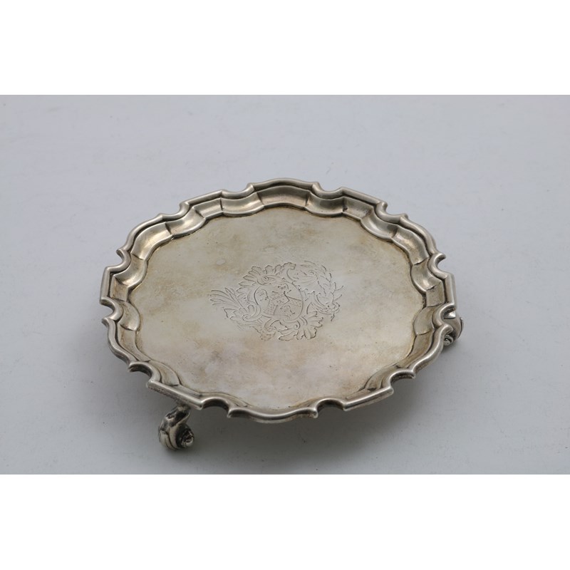 A GEORGE II WAITER with a shaped and moulded border and three scroll feet, engraved in the centre with a rococco coat of arms*, struck on the reverse with a maker's mark "WH" (four times), unascribed, probably provincial/colonial, c.1740; 5.95" (15 cms) diameter; 10.3 oz *Arms of Keyt of Ebrington, Glos.