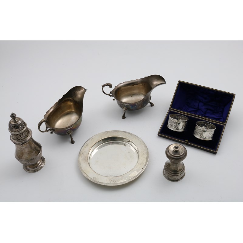 with a high-domed, bayonet-fitting cover by A & F. Parsons (for Tessiers), London 1926, a pair of sauce boats by Williams (Birmingham) Ltd., Birmingham 1912, a circular dish or stand, a cased pair of chased napkin rings and a pepper mill (metal innards); the caster 6.5" (16.5 cms) high; 21.9 weighable silver (6)