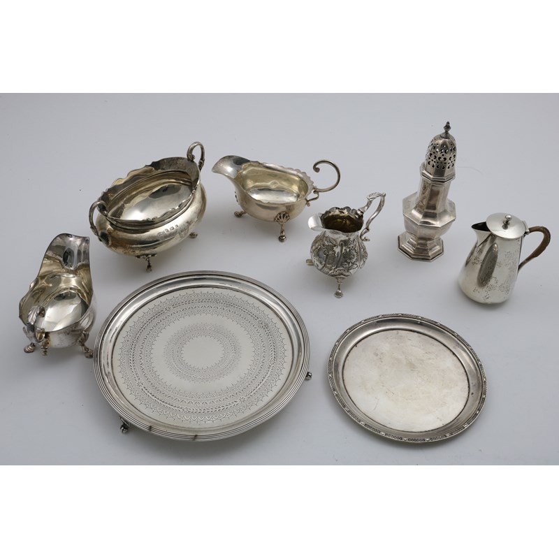 A late Victorian small salver with bright-engraving and a reeded rim, a small circular stand or waiter, an Edwardian two-handled sugar bowl, crested, two small sauce boats, a George III embossed cream jug, a small hot milk jug with cane-insulated handle and an octagonal sugar caster; the latter 6.75" (17.2 cms) high; 40.3 oz (8)