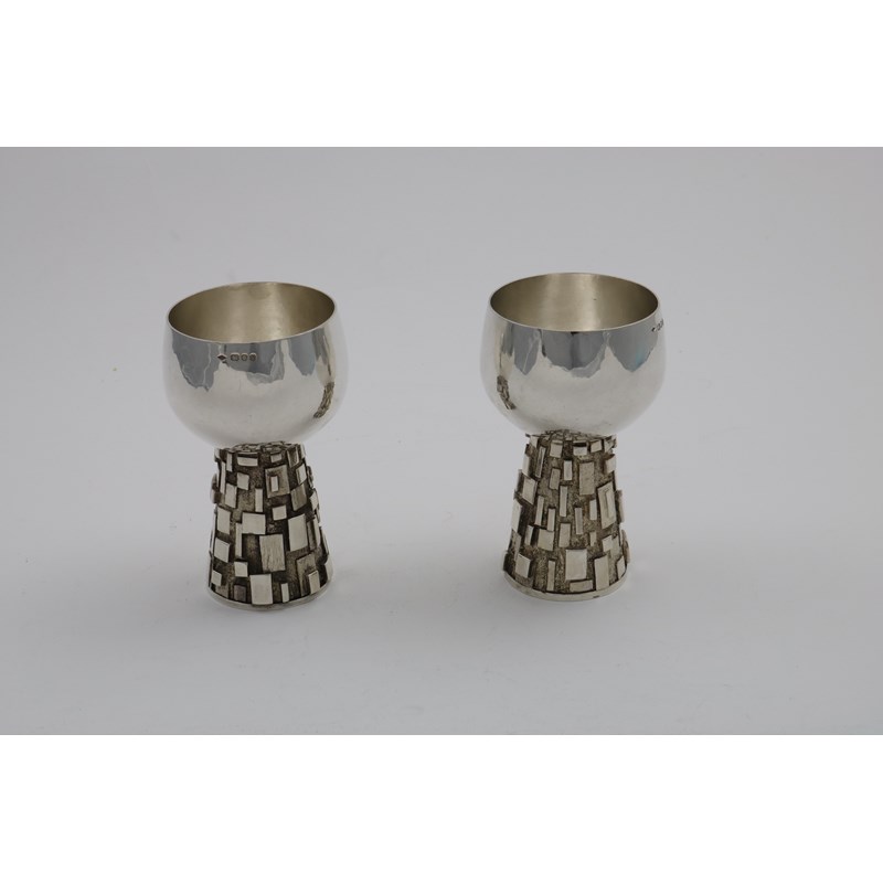 A pair of late 20th century handmade goblets, the conical stems with applied and textured decoration, hallmarked London 1975; 5.45" (13.8 cms) high; 20.9 oz (2)