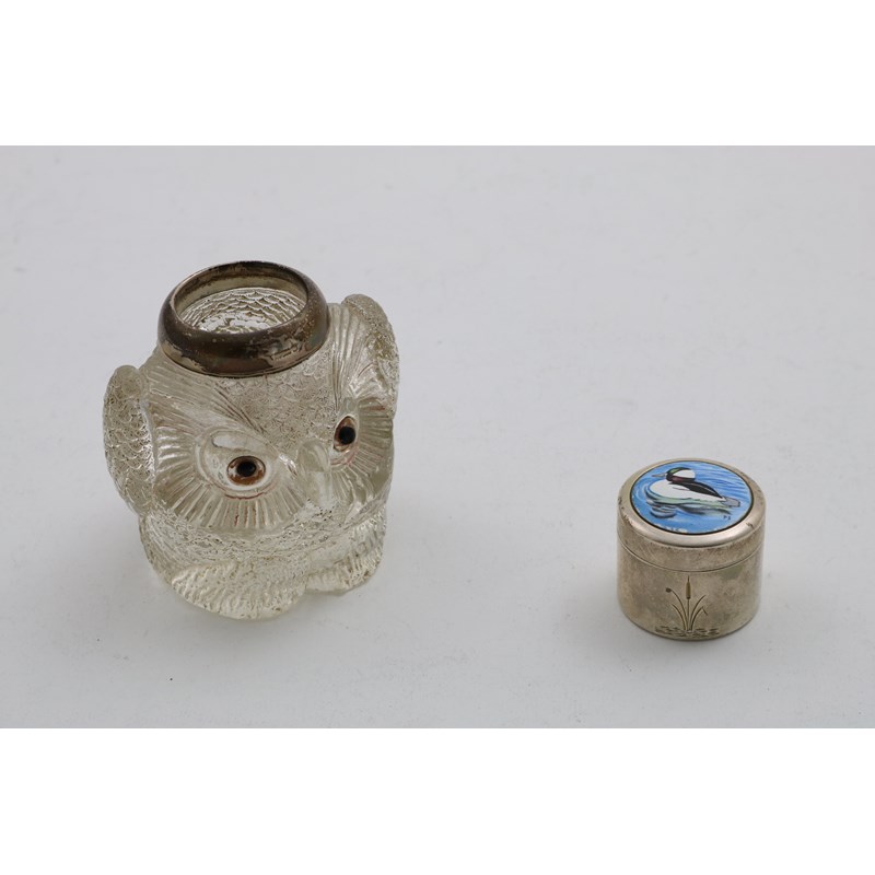 A small late 20th century, limited edition box engraved with bulrushes around the sides, the cover enamelled with the image of a drake Bufflehead on water (after Sir Peter Scott), gilt interior, hallmarked London 1978 and a late Victorian mounted glass vesta holder/striker in the form of an owl (with Registered Design No. "416529"), marks worn c.1900; the latter 2.75" (7 cms) high; 0.9 oz weighable silver (2)