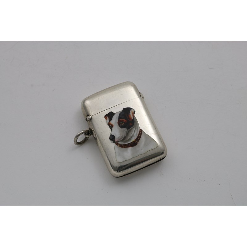 of plain rounded oblong form, enamelled on the front with the portrait of a Jack Russell terrier, the reverse monogrammed, gilt interior, by S. Mordan & Co.,,London 1902; 2" (5 cms) long; 1 oz