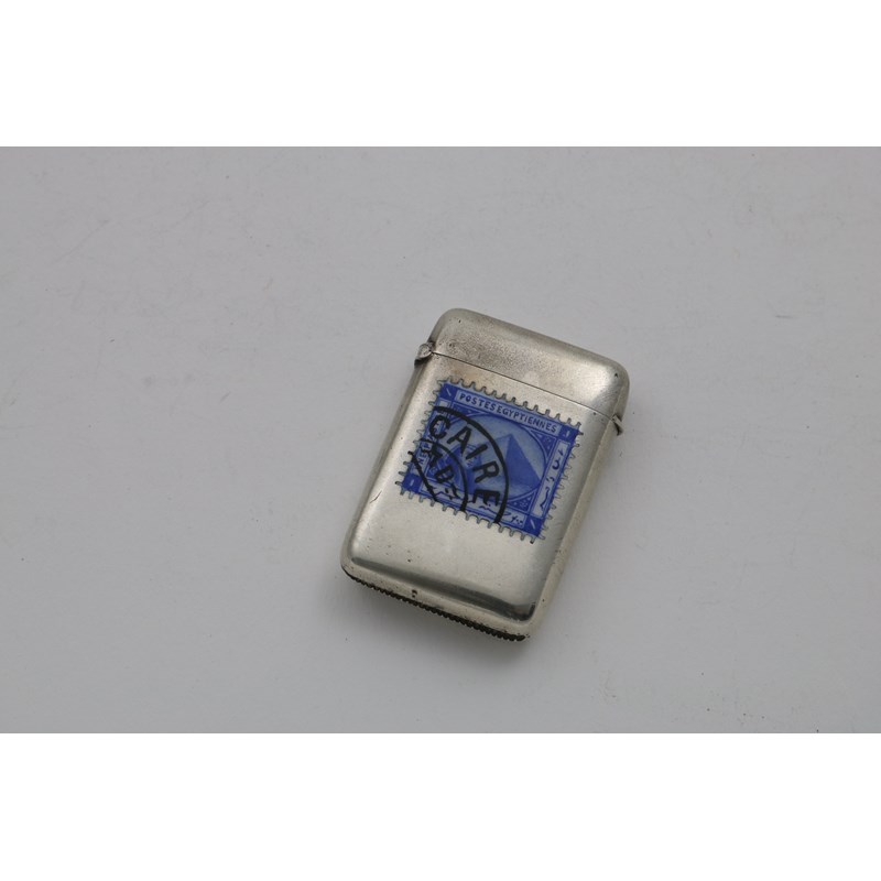 of plain, rounded oblong form, enamelled on the front with a powder blue "POSTES EGYPTIENNES" stamp, postmarked "CAIRE" (Cairo), unmarked c.1900; 2" (5 cms) long; 1.25 oz